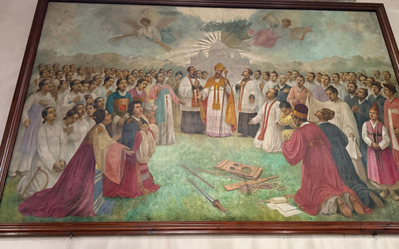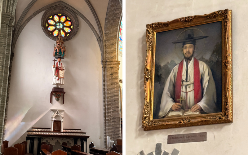 Beim Gehen durch die Seitengänge sind mir auch Bilder aufgefallen, die ehemalige Missionare oder Geistliche zeigen. Anders, als erwartet tragen sie darauf keinen Talar, sondern Hanbok, den traditionellen koreanischen Anzug, und oft auch den typischen Hut aus der Joseon-Zeit. Das macht deutlich, wie sehr sich der katholische Glaube hier mit der koreanischen Kultur verbunden hat.