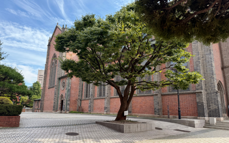 Myeong-dong gehört zu den bekanntesten Stadtteilen Seouls. Die Straßen sind eng, voller Menschen, Läden und Verkaufsstände. Kosmetik, Mode und K-Pop-Artikel prägen das Bild genauso wie das Streetfood, das hier fast an jeder Ecke angeboten wird. Mitten in diesem Trubel steht die Kathedrale von Myeong-dong. Ihr roter Backstein und der hohe Turm fallen sofort ins Auge. Diese Kirche erinnert mich eher an Kirchen in Europa, ganz anders, als ich es in Korea erwartet hätte.