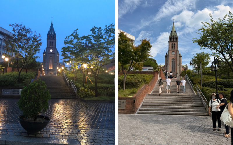 Besonders schön ist der Besuch am späten Nachmittag. Dann fällt das Licht durch die Glasfenster in den Innenraum, und auch draußen auf dem Vorplatz wird die Atmosphäre ruhiger. Viele Menschen nutzen die Gelegenheit, noch einmal zu sitzen, bevor sie zurück ins geschäftige Myeong-dong gehen.
