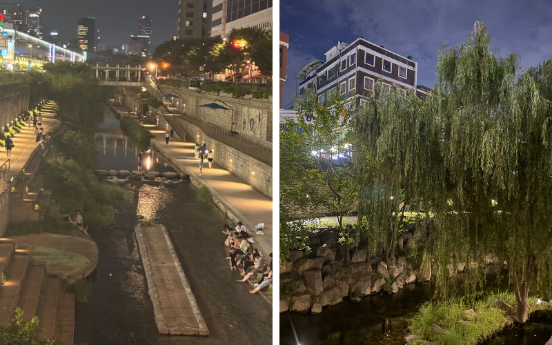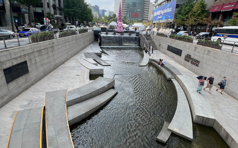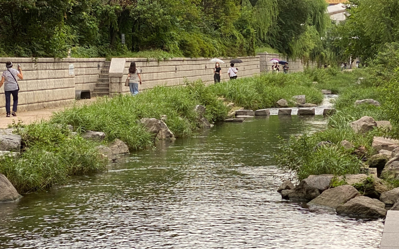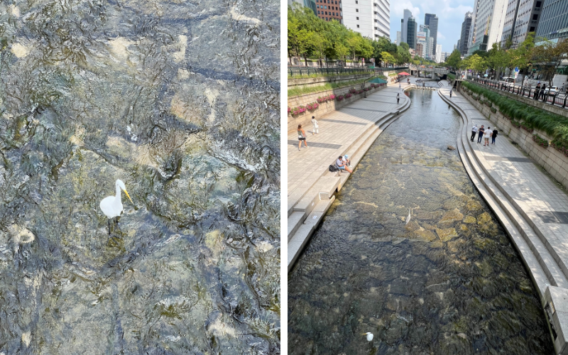 Der Cheonggyecheon ist nicht nur ein künstlich geformter Wasserlauf, sondern auch ein Stück Natur im Zentrum von Seoul. Entlang des Wegs wachsen Pflanzen, im Wasser sieht man Fische. Vögel haben den Fluss ebenfalls als Lebensraum entdeckt. Für viele ist das eine Pause vom dichten Straßenverkehr und den hohen Gebäuden ringsum. Ich selbst habe hier schon Momente erlebt, in denen die Stadt weit weg schien, obwohl ich mich mitten im Zentrum befand.