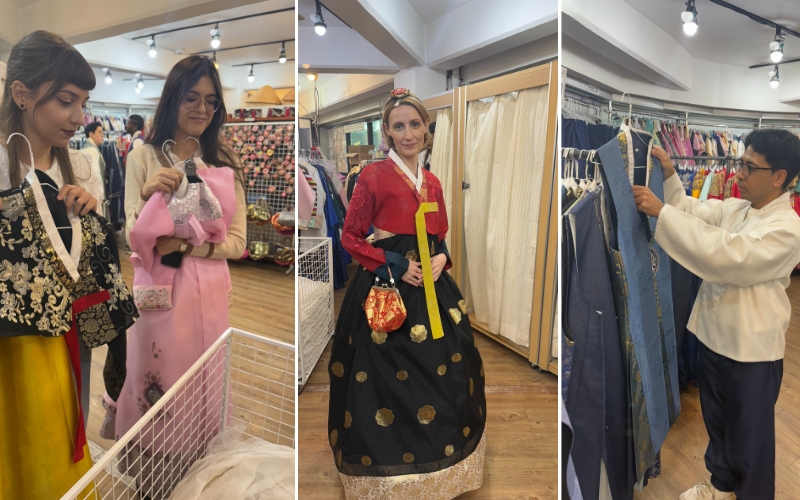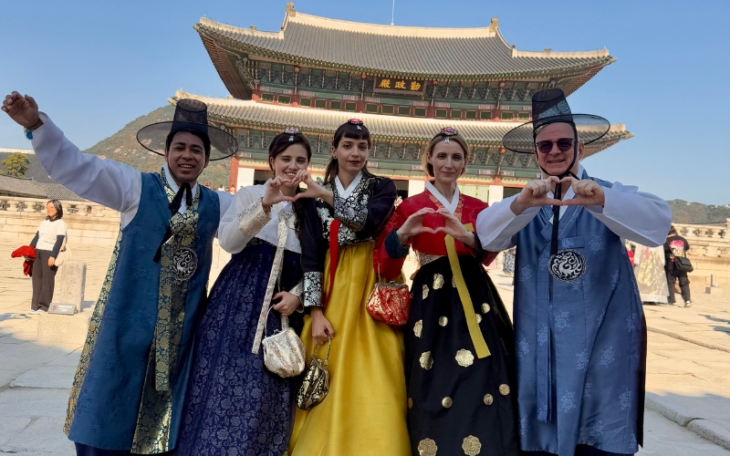 Bereits vor dem Betreten dieses historischen Juwels erlebten wir ein Highlight, das uns völlig in die Geschichte eintauchen ließ – wir schlüpften in traditionelle Hanboks, die nicht nur wunderschön anzusehen waren, sondern uns auch das Gefühl gaben, ein Teil der Vergangenheit zu sein.