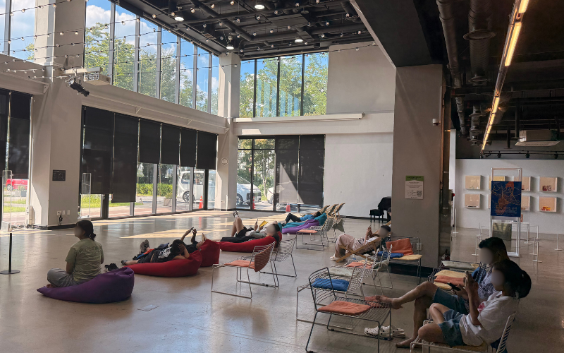 Nodeul Island unterscheidet sich in der Atmosphäre von Yeouido, der bekanntesten Flussinsel im Hangang. Während es dort am Wochenende oft so voll ist, dass kaum noch Platz bleibt, geht es auf Nodeul Island ruhiger zu. Auf den Wiesen am Ufer verbringen Paare und Freunde ihre Zeit. Jugendliche spielen mit dem Ball und nutzen die Insel als Treffpunkt, um den Tag draußen zu verbringen.