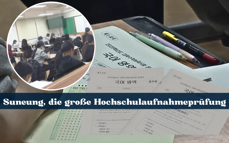Am 13. November ist in Korea die Suneung (수능), die zentrale Hochschulaufnahmeprüfung. Für Millionen von Schülern ist es der Tag, auf den sie seit zwölf Jahren hinarbeiten. Das Ergebnis bestimmt, ob sie eine Universität besuchen und welchen weiteren Weg sie einschlagen.