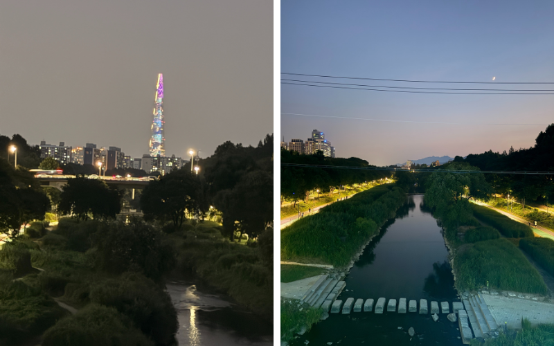 Als ich auf einer Brücke am Fluss stand, war ich von der Weite und der Aussicht fasziniert. Das habe ich mitten in Seoul nicht erwartet. Der Blick öffnet sich, man sieht über die Wohnanlagen hinaus bis hin zum Lotte World Tower in der Ferne. Gleichzeitig bleibt die Stimmung ruhig, beinahe intim. Menschen bewegen sich langsamer, Gespräche klingen leiser, und das Rauschen des Wassers mischt sich mit den Stimmen.